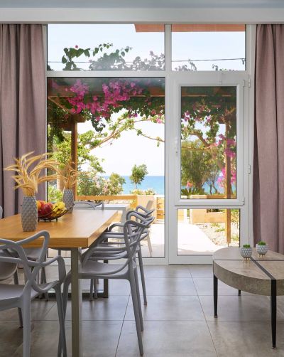 This spacious family apartment features an open-plan living room and fully equipped kitchen with a comfortable sofa bed. It includes two bedrooms, one with a double bed and one with two single beds, as well as a modern bathroom with a shower. All bedrooms are located on the same level as the main living area. An additional bed is available on the loft, accessible via the wooden staircase shown in the photos. The apartment offers a private entrance, a furnished terrace, and a small private garden, ideal for relaxing during your holiday. It is fully equipped with everything needed for a comfortable family vacation. Guests enjoy reliable high-speed Wi-Fi, suitable for streaming, work, and remote teleworking. Wired internet is available upon request. For stays longer than one week, we can also provide a computer monitor, keyboard, and mouse, making the apartment ideal for long-term stays and digital nomads.